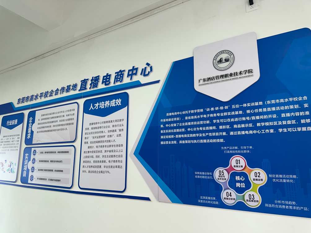为对接粤港澳大湾区数字贸易、高端制造等行业企业需求,联合行业头部企业实行双主体协同育人模式,3月17日,广东酒店管理职业技术学院举行直播电商中心正式投入使用,标志着历时一年精心打造的“训-赛-研-培-创”五位一体的数字营销实训基地落成,该中心不仅是东莞市高水平校企合作基地的重要成果,也体现了广酒学院在建设省级高水平电子商务专业群实战基地方面的显著进展,同时反映了学院在创新与发展道路上的持续努力。